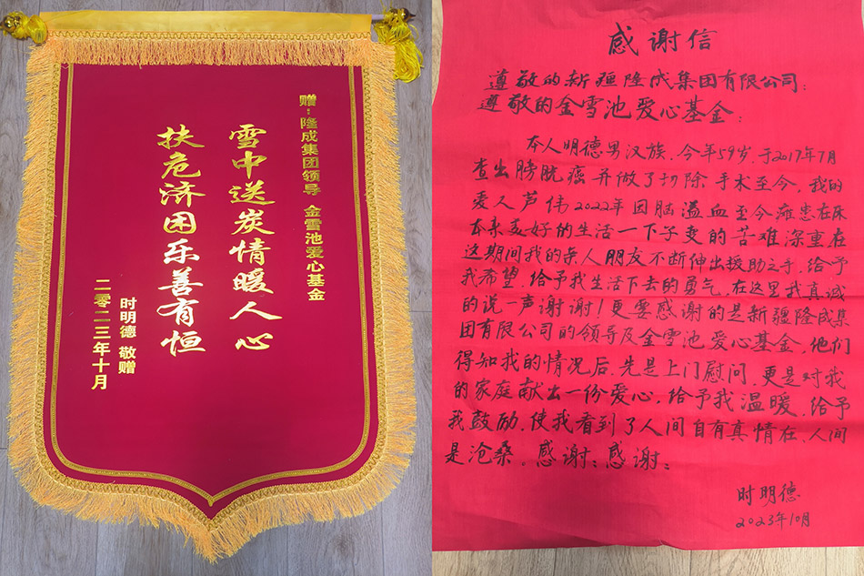 時(shí)明德夫婦所居住的水塔山街道新居巷社區(qū)主任及包戶干部一同參加現(xiàn)場(chǎng)捐贈(zèng),并代表社區(qū)對(duì)隆成集團(tuán)“金雪馳愛心基金”表達(dá)了感謝?!敖鹧Y愛心基金”是隆成集團(tuán)對(duì)社會(huì)的感恩回報(bào),攜帶著集團(tuán)的溫暖,融化了時(shí)明德夫婦的心。二人接受捐贈(zèng)時(shí)非常激動(dòng),一直不停在說,“這真的是雪中送炭”,“不是親人,勝似親人”。時(shí)明德本人更是制作了一面錦旗,并手寫了一封感謝信,信中滿是感謝二字。他表示,此次援助如雪中送炭,予以了生活下去的勇氣。