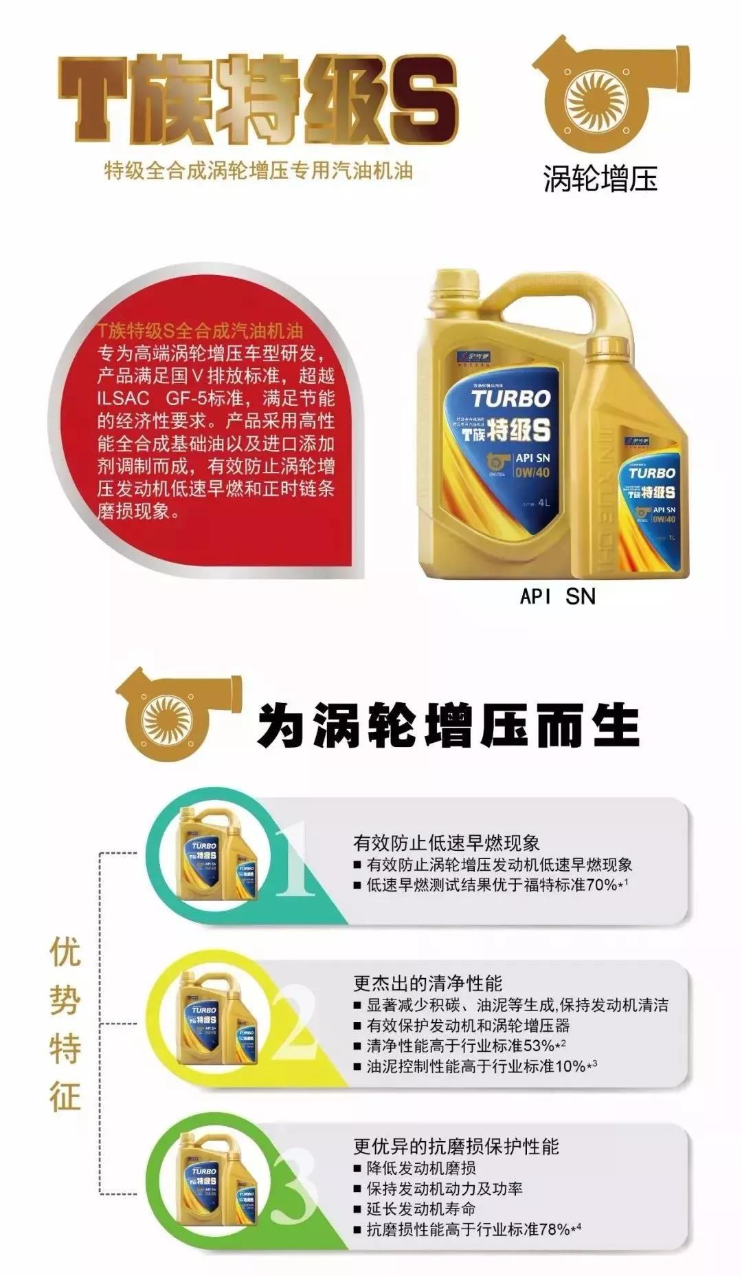 T族特級S全合成汽油機油作為國內首款高端渦輪增壓發(fā)動機專用汽油機油,在產品設計上極大地放大了渦輪增壓發(fā)動機的動力優(yōu)勢,彌補了低速早燃和正時鏈條磨損等方面的不足,在抗高溫、抗氧化、抗磨損等方面有著超強的優(yōu)越性,滿足了更多高性能車主及駕駛愛好者的差異化需求。