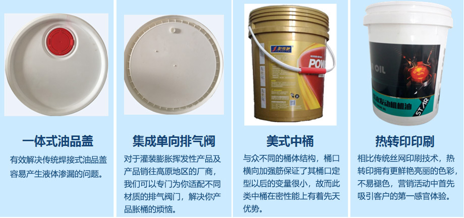 我們?yōu)榭蛻籼峁┡蛎浶砸后w的排氣解決方案,解決液體肥料膨脹問題以及油品運往高海拔地區(qū)時的桶內(nèi)壓力變化問題;提供塑料制提手,握感更為舒適且承重能力大幅提高;一體式包圍油品蓋,解決傳統(tǒng)焊接小蓋滲漏問題;配套為客戶提供桶身絲網(wǎng)印刷及更為高檔的熱轉(zhuǎn)印印刷方案。